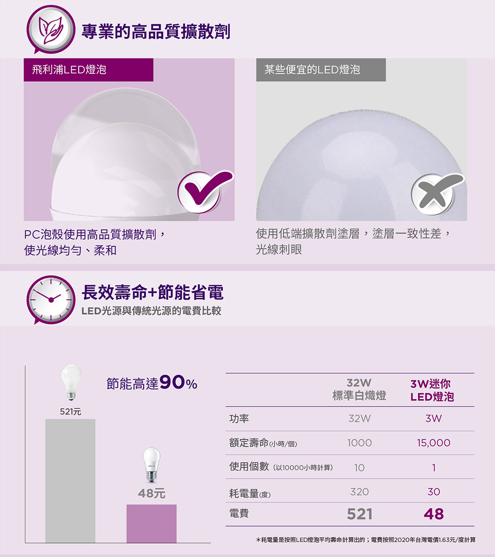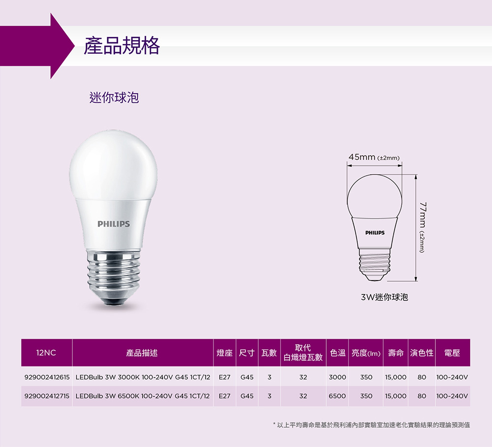 - 亮度:350lm(流明)、功率:3W、可取代32W一般燈泡