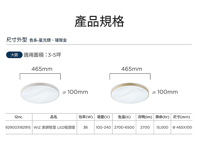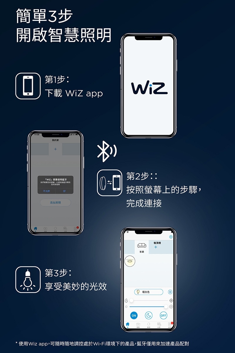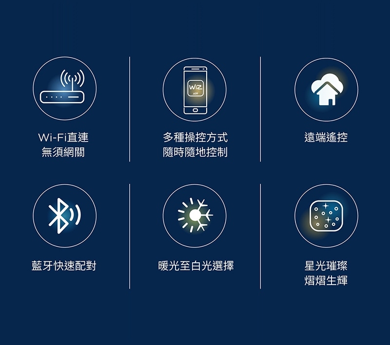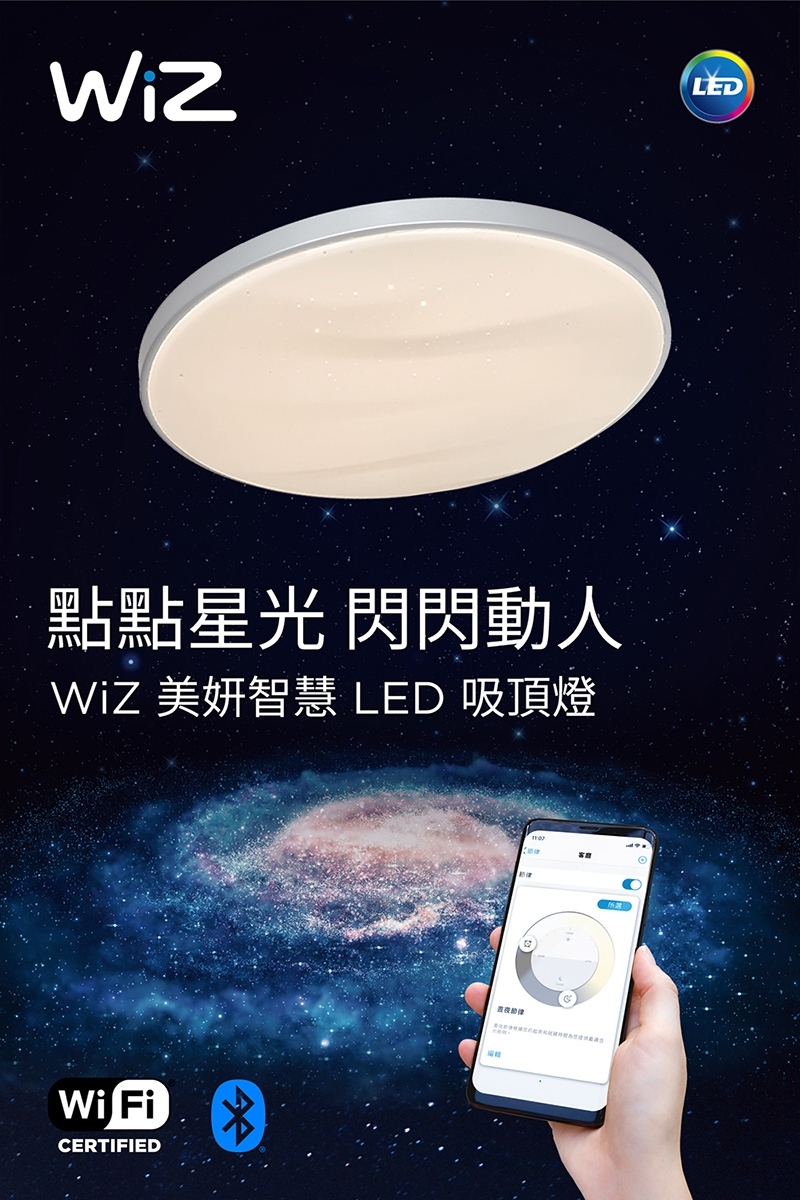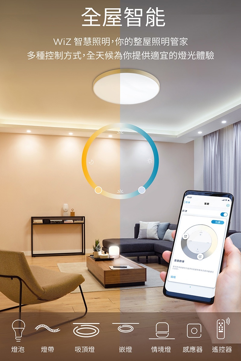 - 透過WIZ APP 開啟智慧照明,多種預設場景與記憶功能,訂製你的專屬燈效