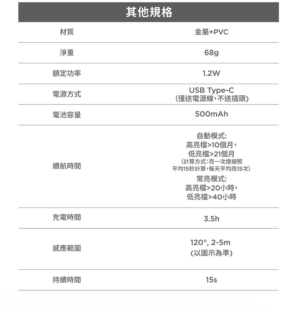 - 兩段亮度,色溫3000K,自動模式每次亮燈持續15秒