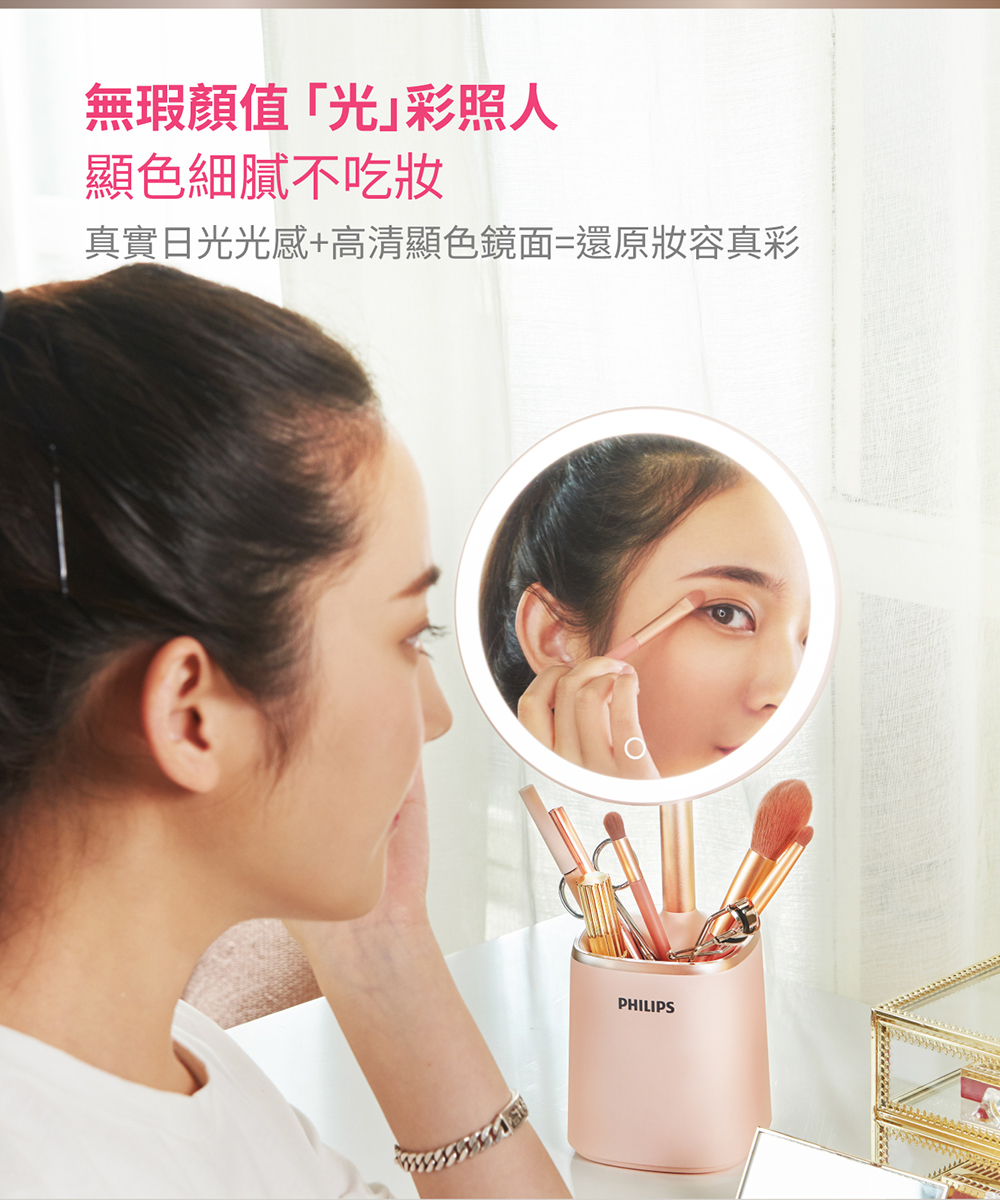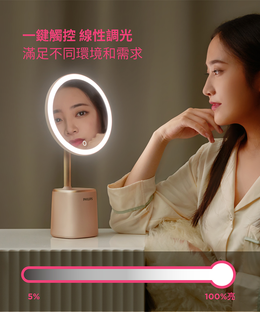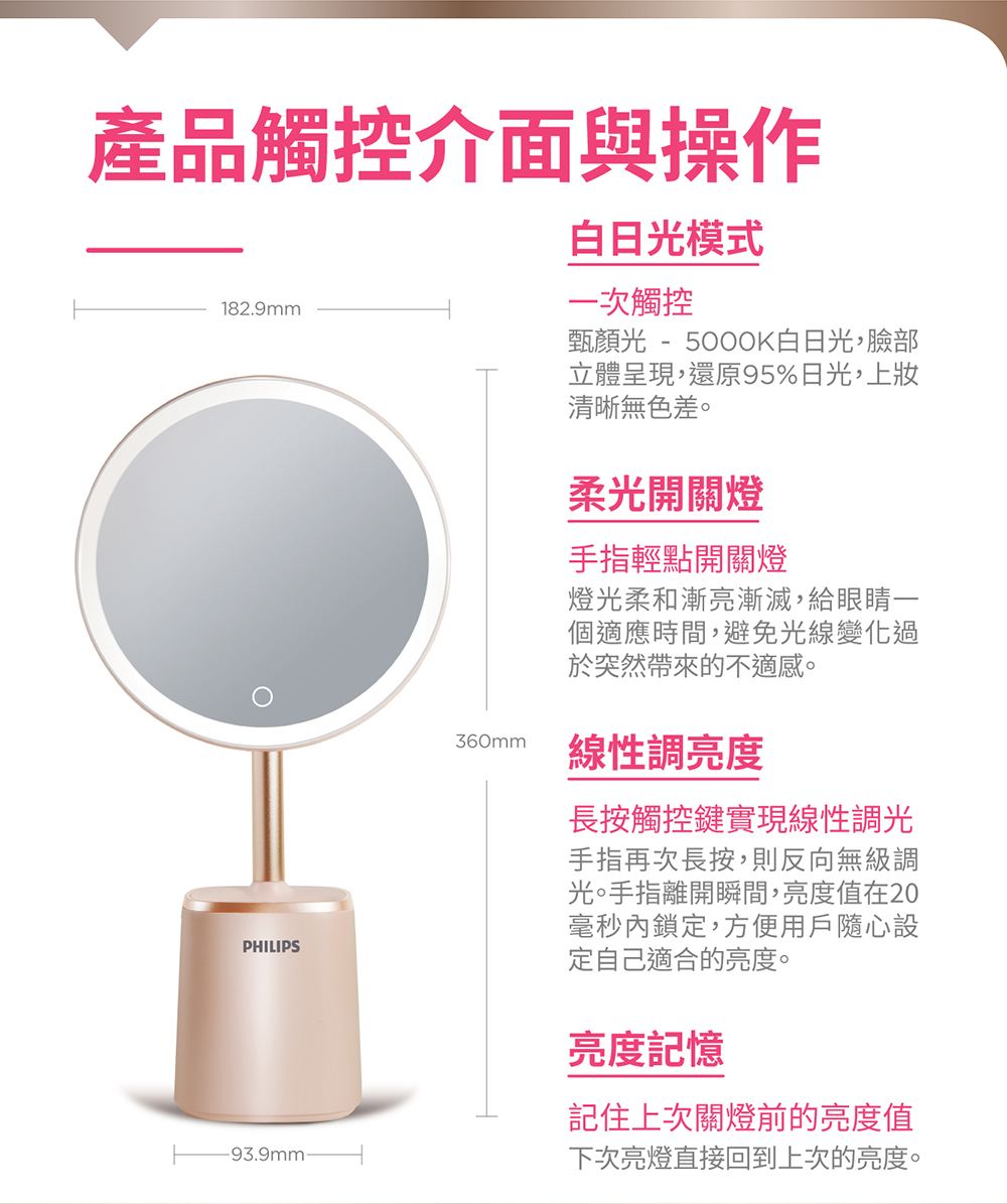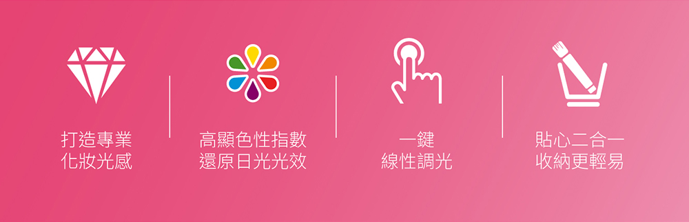 - 補妝收納一鏡搞定,具備高顯色性、明亮5000K白日光色溫、一鍵無段調光、內建亮度記憶。