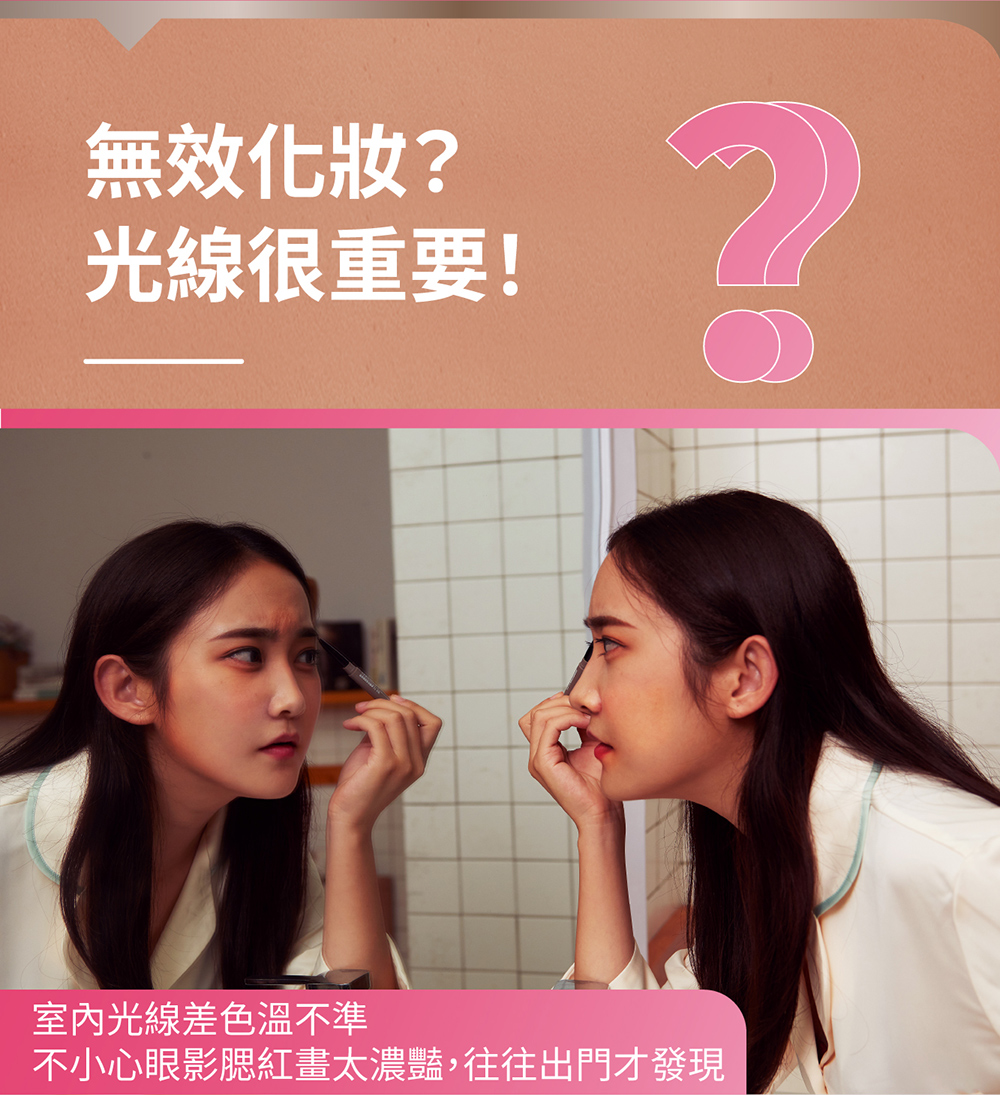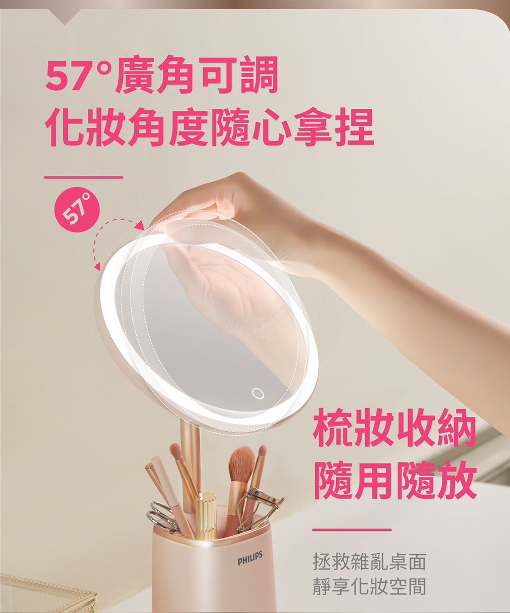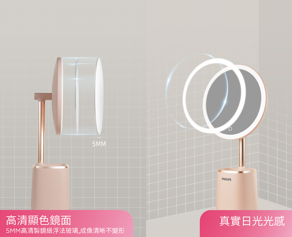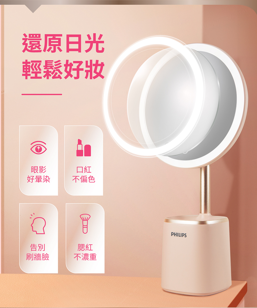 - 補妝收納一鏡搞定,具備高顯色性、明亮5000K白日光色溫、一鍵無段調光、內建亮度記憶。